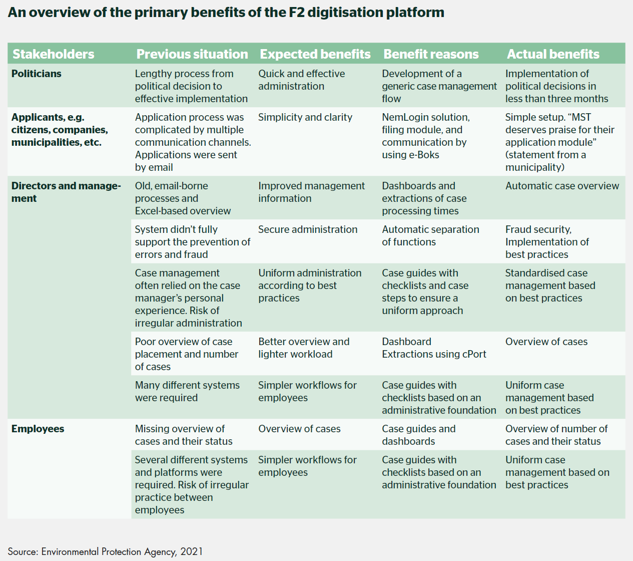 Throughout the project the EPA kept their focus on the potential benefits. They have kindly agreed to let us share their results as to inspire other authorities. The benefit realisation of the F2 programme is extensive and can be evaluated using two dimensions: financial and qualitative benefits with a common denominator of effective administration.